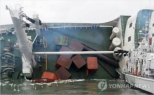 16일 세월호 침몰 당시 갑판에 실린 컨테이너가 바다에 쏟아지고 있다. (연합뉴스)