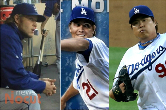 '다저스 에이스 3인방의 엇갈린 명암' 올 시즌 호주 원정 출전에 따라 극명하게 희비가 교차하고 있는 LA 다저스 선발 3인방 클레이튼 커쇼(왼쪽부터)-잭 그레인키-류현진.(자료사진=다저스 트위터, 게티이미지)