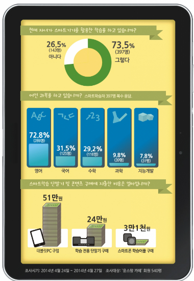 한편, 스마트학습을 위한 비용 투자도 아끼지 않고 있었다. 사용 중인 스마트학습 단말기로는 '학습지 및 학원 전용 단말기'가 43.1%로 가장 많았고 태블릿PC는 36.0%, 스마트폰은 21.9%였다. 업체 전용 단말기 평균 구매비용은 24만원으로, 태블릿PC 평균 구매비용인 51만원의 절반 수준이었다. 스마트폰 사용자의 경우 학습용 유료 어플 및 콘텐츠 구매에 평균 3만1000원을 지출한 것으로 집계됐다.