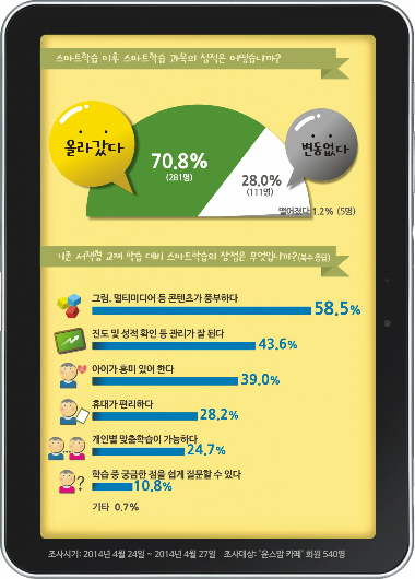 스마트학습은 실제 성적에도 영향을 미쳤다. 스마트학습을 하는 학생의 70.8%는 스마트학습 후 '성적이 올랐다'고 답했다. '성적 변동이 없다'는 답변은 28.0%였고, '성적이 떨어졌다'는 응답은 1.2%였다.
