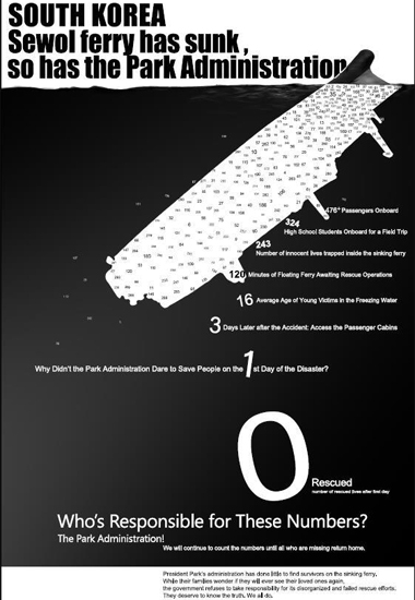 모금운동 진행과 함께 공개된 광고 시안에는 'Sewol Ferry has sunk, So has the Park Administration(세월호와 함께 박근혜 정부도 침몰했다)'는 문장과 함께 침몰한 세월호의 모습이 담겨져 있다.
