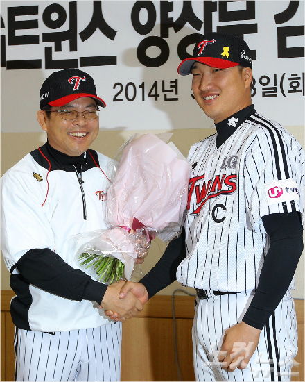 '믿는다, 믿습니다' 올 시즌 초반 김기태 감독의 급작스러운 사퇴로 위기에 빠진 LG는 후임 양상문 감독 부임 이후 빠르게 회복하는 모습을 보이고 있다. 사진은 지난 13일 양상문 감독(왼쪽)이 취임식에서 주장 이진영과 악수를 나누는 모습.(자료사진=박종민 기자)
