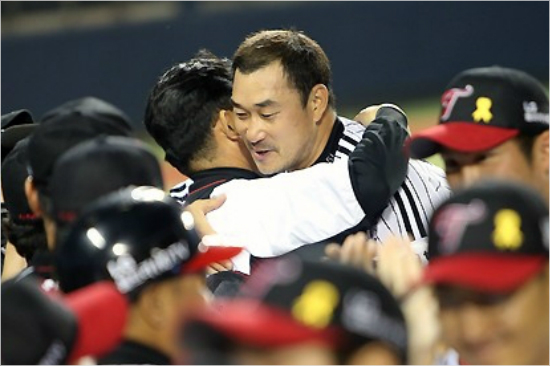 '중근아, 잘 했다' 양상문 감독이 13일 부임 첫 경기에서 승리를 지켜낸 마무리 봉중근을 껴안는 모습.(자료사진=LG)