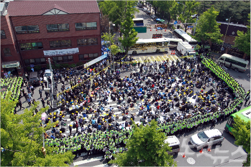 세월호 참사 사망자와 연간 교통사고 사망자의 비교 논란과 관련 세월호 참사 유가족들이 9일 오전 청와대 인근 청운동 사무소 앞에서 박근혜 대통령과의 면담과 KBS 사장의 공개사과, 보도국장 파면 등을 요구하며 연좌농성을 하고 있다. 윤창원기자