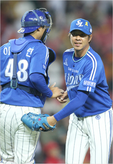 '창용불패는 이어진다' 삼성 임창용(오른쪽)이 16일 KIA전 승리를 지켜낸 뒤 이흥련과 기쁨을 나누고 있다.(광주=삼성 라이온즈)
