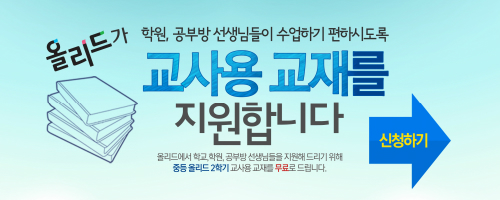 2학기 내신 대비 학습서 중등 '올리드' 신간 출시를 기념해 실시되는 이번 이벤트는 중등 '올리드'를 수업에 활용하는 중등 학원·공부방 선생님들을 지원하기 위해 마련됐다. 올리드 선생님 전용 사이트(www.allead.co.kr)에서 2학기 중등 '올리드' 국어, 영어, 수학, 사회, 과학 총 5과목의 교재를 신청할 수 있으며 교재 1권당 선착순 100부 한정으로 무료 증정하는 혜택을 제공한다.