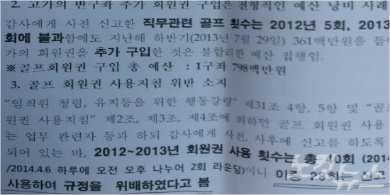 더욱이 킨텍스 대표를 비롯한 일부 임원들은 지난 2012년부터 2013년까지 40차례에 걸쳐 골프장을 이용했지만 감사에게 사전 신고하고 정상적으로 사용한 것은 12회에 불과하고 나머지 28회는 신고 없이 사용했다.