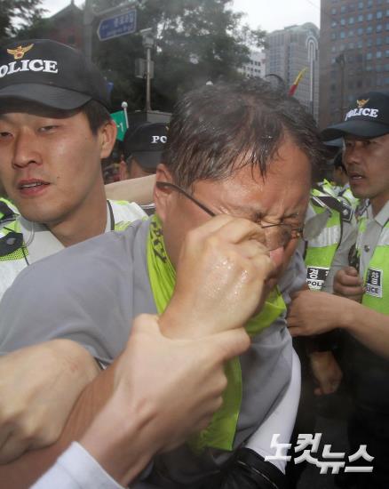 28일 오후 서울 중구 보신각에서 경찰이 쌀개방 반대 민영화 저지 및 민중생존권 쟁취 범국민대회를 마친 뒤 행진을 하던 한 참가자를 도로점거를 이유로 연행하고 있다.