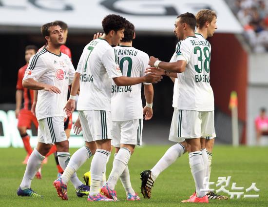 30일 오후 서울 마포 월드컵경기장에서 열린 독일 바이엘 04 레버쿠젠(이하 레버쿠젠)과 FC서울의 경기에서 레버쿠젠 손흥민이 선제골을 성공시킨 카림 벨라라비(38)와 세리머니 하고 있다.