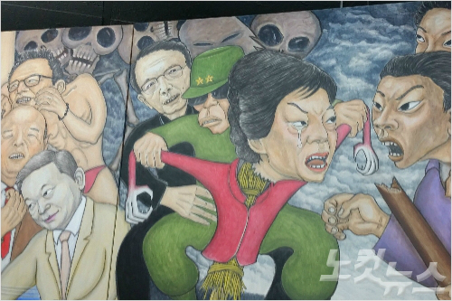 특히 박근혜 대통령을 박정희 전 대통령과 김기춘 비서실장의 조종을 받는 허수아비로 묘사한 부분이 포함돼 광주시가 내용 수정을 요구하고 작품 설치를 막아서면서 논란이 일었다.