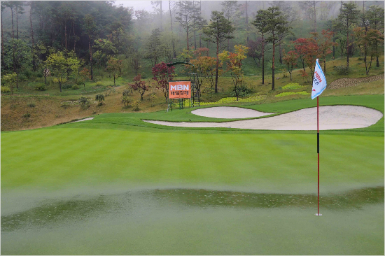 한국여자프로골프(KLPGA)투어 'MBN 여자오픈 with ONOFF' 1라운드가 열릴 예정이던 21일 경기도 양평 더스타휴 골프장에 폭우가 내려 첫날 경기가 취소됐다. 사진은 비에 잠긴 15번 홀 그린(자료사진=KLPGA)