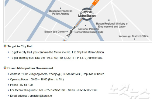 부산시 영문 홈페이지, 시청 찾아오는길을 안내하는 지도 아래에 부산시가 'Busan Metropolitan Government'로 표기돼 있다.