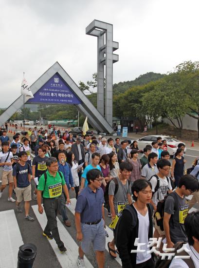 세월호특별법 제정을 촉구하는 서울대 교수·학생·동문들이 25일 오후 서울 관악구 서울대학교 정문에서 도보행진을 하고 있다. 참가자들은 유가족들의 농성장이 있는 광화문광장까지 14㎞ 가량의 거리를 행진할 예정이다.