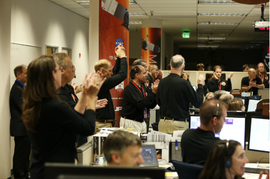 NASA 고다드 우주비행센터에서 메이븐이 화성궤도 진입에 성공하자 직원들이 박수를 치며 환호하고 있다 출처=NASA