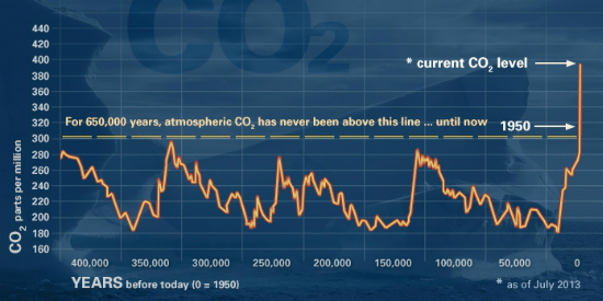 빙하 속에 포함된 대기 샘플과 최근 측정 결과에 근거, CO2의 양을 나타낸 그래프. 대기 중 CO2가 산업혁명 이후 증가해왔다는 사실을 입증해 준다. (사진 출처=미국국립기후자료센터)