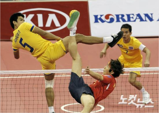3일 오전 부천체육관에서 열린 2014 인천아시안게임 세팍타크로 남자 레구 결승전 대한민국과 태국의 경기에서 한국의 임안수가 공격하고 있다. (윤성호 기자)