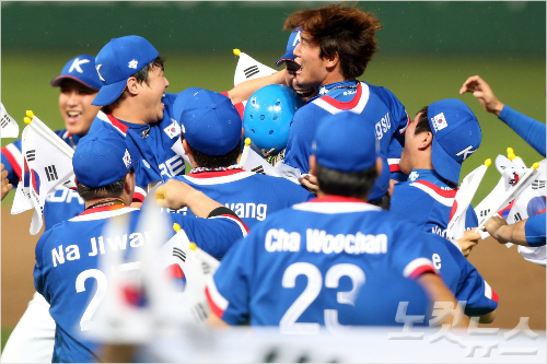 9월 28일 오후 인천 문학야구장에서 열린 인천아시안게임 야구 결승전 한국과 대만의 경기에서 대만에 6대3 으로 승리하며 금메달을 확정지은 대표팀 선수들이 환호하고 있다. 황진환기자