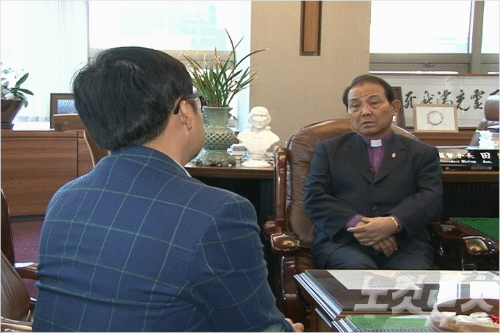 기독교대한감리회 전용재 감독회장이 22일 CBS와의 인터뷰에서 제31회 총회 상정 안건들에 대한 생각을 이야기하고 있다.