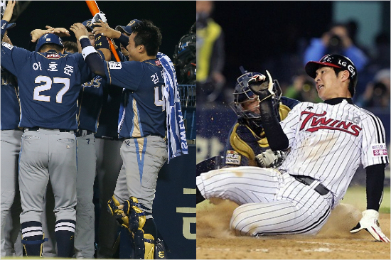 '우주의 기운은 어디로?' 24일 준플레이오프 3차전에서 6회 결승 솔로포를 터뜨린 NC 이호준(왼쪽)과 5회말 홈에서 아웃되고 있는 LG 오지환의 모습.(자료사진=NC, LG)