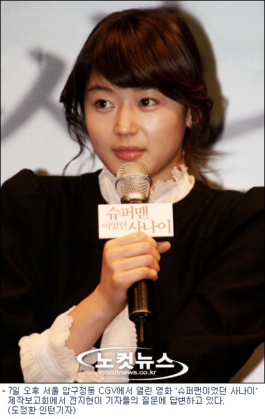 전지현은 7일 오후 서울 압구정 CGV에서 열린 영화 ‘슈퍼맨이었던 사나이’(정윤철 감독, CJ엔터테인먼트 제작) 제작보고회에서 “건강을 무엇보다 최우선으로 생각하는 내가 영화가 대박날 것 같고, 또 황정민씨와 정윤철 감독과 일하는 영광을 놓치기 싫어 담배를 피웠다”면서 “처음에는 금연초로 시작했는데 좋은 것도 중독되고, 나쁜 것도 중독되듯이 점점 금연초에 중독되는 것 같아 니코틴이 적은 담배를 피웠다”며 당시 ‘흡연신’에 대한 고충을 털어놨다.
