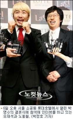 6일 오후 서울 소공동 롯데호텔에서 열린 박명수의 결혼식에 유재석, 노홍철, 정형돈(30), 하하(29)가 참석해 우정을 과시한 것. 이날 정형돈과 하하는 박명수를 위한 깜짝 이벤트로 축가를 준비하기도 했다.