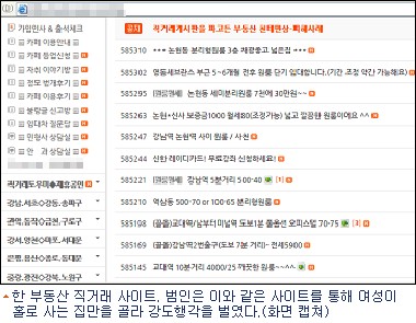 서울 강남경찰서는 인터넷 부동산 직거래 사이트에 등록된 전·월세 광고를 보고 혼자 사는 여성만을 골라 강도행각을 벌인 혐의로 김 모(36) 씨를 구속했다.