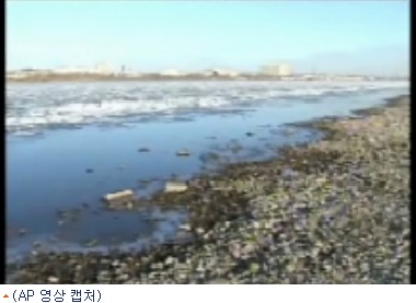 러시아 국경 인근 강이 온통 얼음 덩어리로 뒤덮여 쇄빙선이 떠다녔다.