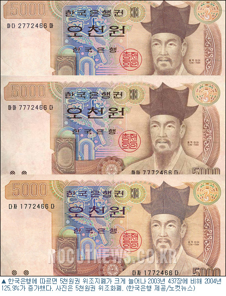 한국은행이 위조지폐 발견현황을 분석한 결과 5천원권 위조지폐는 지난해 987장이 발견돼 전년의 437장에 비해 125.9%가 증가했다.