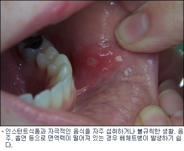 베체트병은 터키 의사인 베체트가 처음 발견한 질환으로 현재까지 그 원인과 명확한 치료법이 없는 염증질환이다. 주로 20~30대 젊은 층에게서 발병하며 구강 궤양과 외음부궤양, 다리에 피부질환이 생기는 특징이 있다.