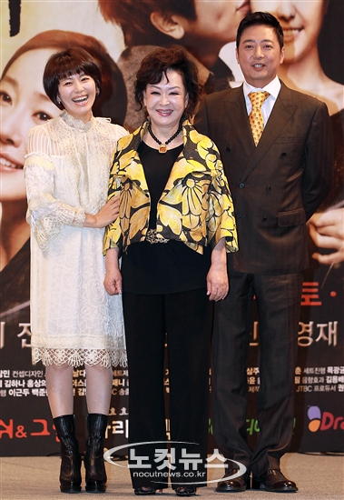 22일 오후 서울 논현동 임피리얼팰리스호텔에서 진행된 JTBC주말드라마 ‘무자식 상팔자’ 제작발표회에 참석한 견미리(왼쪽부터), 전양자, 윤다훈이 포즈를 취하고 있다.