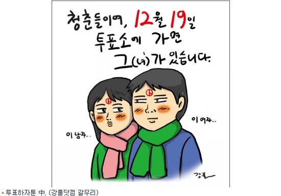 또 인기 만화가 강풀과 조남준, 주호민 등은 지난 8일부터 트위터에 하루에 하나씩 투표독려 그림을 그리는 '투표하자툰' 시리즈를 연재해왔다.
