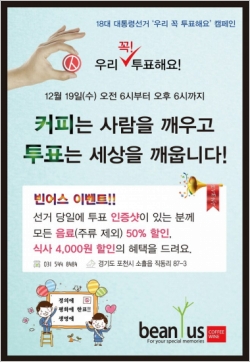하루 앞으로 다가온 제18대 대통령 선거를 앞두고 곳곳에서 이색 투표 장려 이벤트가 펼쳐지고 있다. 연예인 등 유명인사들의 튀는 공약은 물론 투표율을 건 각종 할인 이벤트도 눈길을 끈다.