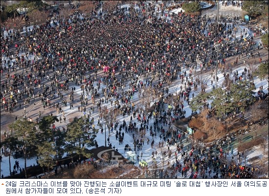 이날 오후 서울 영등포구 여의도 공원에는 약 3,000여명의 사람들이 모였다. SNS와 인터넷으로 미리 공지돼 관심을 모았던 '솔로대첩'에 참가하기 위해서였다.