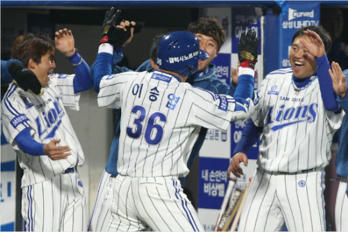 '이래야 이승엽이지' 이승엽이 5일 넥센과 2차전에서 홈런을 때린 뒤 더그아웃으로 들어오자 동료들이 격하게 축하해주고 있는 모습. (사진=삼성 라이온즈 제공)