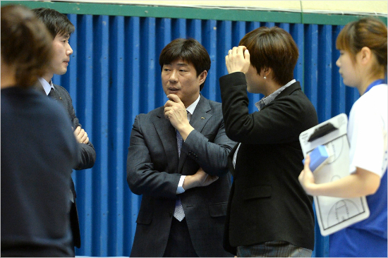 '어떻게 하면 연패를 끊을까' 안세한 KDB생명 감독(가운데)이 13일 신한은행과 홈 경기 도중 코칭스태프와 심각한 표정으로 이야기를 나누고 있다.(구리=WKBL)