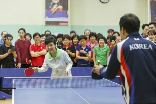 어제는 기타치는 모습이 신문에들 실렸는데요. 오늘은 탁구치는 모습이 연이어 실린 것을 보면 청와대가 요즘 박 대통령의 이미지 변신을 위해 공을 아주 많이 들이고 있는 것 같습니다.