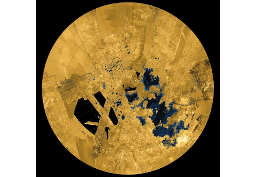 타이탄의 표면에 호수들이 보인다. 이 이미지는 NASA의 카시니 우주선이 보내온 데이터로 만들어졌다. (사진 출처=Cassini Radar Mapper, JPL, USGS, ESA, NASA)