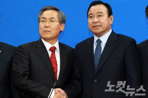 헌법상 예산안 법정 처리시한일인 2일 국회 새정치민주연합 원내대표실에서 열린 양당 주례회동에서 새누리당 이완구 원내대표와 새정치민주연합 우윤근 원내대표가 악수를 하고 있다. (사진=윤창원 기자)