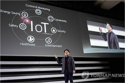 미국 라스베이거스 만달레이 베이 컨벤션센터에서 열린 '2015 CES LG전자 글로벌 프레스 콘퍼런스'에서 LG전자의 IoT 전략 및 플랫폼 '웹 운영체제(OS) 2.0'에 대해 소개하고 있다.