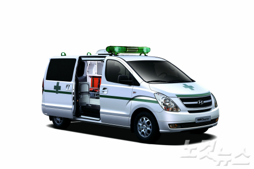 스타렉스 구급차내에는 인공호흡기, 산소탱크, 의료장비 보관함 등이 구비되어 있다.