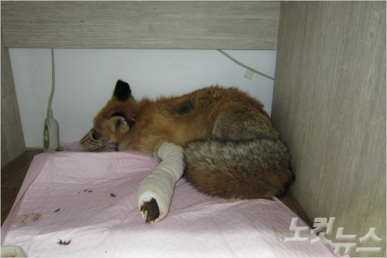덫에 걸려 앞다리가 절단된 여우. 수술 뒤 상처가 아물어 실 뽑는 작업이 진행 중이다. (국립공원관리공단 제공/노컷뉴스)