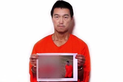 IS에 납치된 일본인 인질 고토 겐지가 또 다른 일본인 인질 유카와 하루나가 살해된 것으로 추정되는 사진을 들고 석방을 요구하고 있다. (사진=유튜브 영상 캡처)