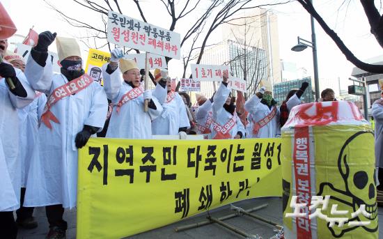 12일 오전 서울 세종대로 원자력안전위원회(원안위) 전체회의에서 30년의 설계수명이 끝난 뒤 가동이 3년째 중단된 원자력발전소 월성 1호기의 계속운전 허가 여부를 심사중인 가운데 경북 월성 주민들이 월성 1호기 폐쇄를 촉구하며 구호를 외치고 있다.