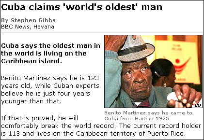 BBC에 따르면 그 주인공은 베니토 마르티네즈로 그는 자신이 123살이라고 주장하고 있다. 그러나 쿠바의 전문가들은 실제로 그의 나이가 그보다 4살 적은 나이로 보고있다.