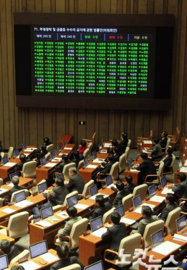 3일 오후 국회 법사위를 통과한 김영란법(부정청탁 및 금품등 수수의 금지에 관한 법률안)이 본회의에서 재석 247인, 찬성 226인, 반대 4인, 기권 17인으로 가결되고 있다. (사진=윤창원 기자)