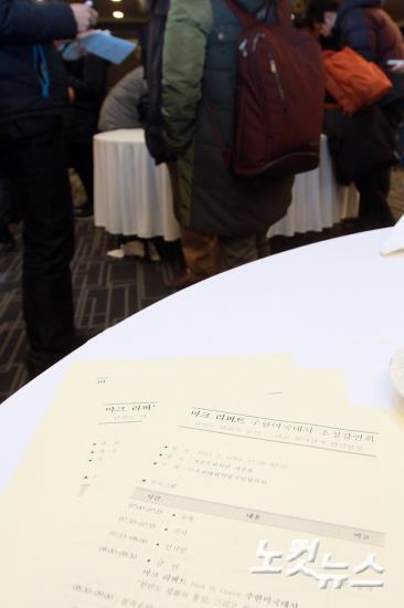 마크 리퍼트 주한 미국 대사가 민화협 주최 조찬강연회에서 50대 남성으로부터 피습을 당한 가운데 5일 오전 행사가 열렸던 서울 세종문화회관 세종홀에서 현장 목격자들이 당시 상황을 설명하고 있다.
