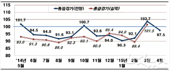 이는 작년 하반기 이후 줄곧 90대 초중반을 맴돌던 전망치보다는 한결 개선됐지만, 전월 전망치 103.7에서 다시 악화 국면으로 돌아선 것이다.