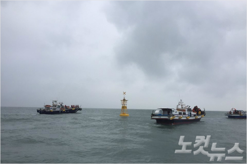 3일 오전 세월호 참사가 발생한 맹골수도 해역. 침몰한 세월호의 선미 부분을 알리는 노란 부표를 중심으로 교계인사와 유가족을 태운 배가 모이고 있다.