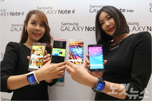 지난해 출시한 '갤럭시 노트4'와 '갤럭시 노트 엣지'와 스마트 웨어러블 기기인 '기어S' 자료사진 (윤성호기자)