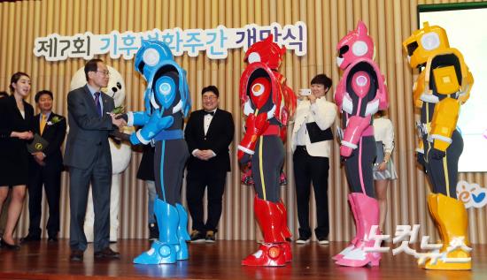 윤성규 환경부 장관이 22일 오전 서울 중구 포스트타워에서 열린 제7회 기후변화주간 개막식에서 애니메이션 캐릭터 '최강전사 미니특공대'에게 홍보대사 위촉장을 수여하고 있다.